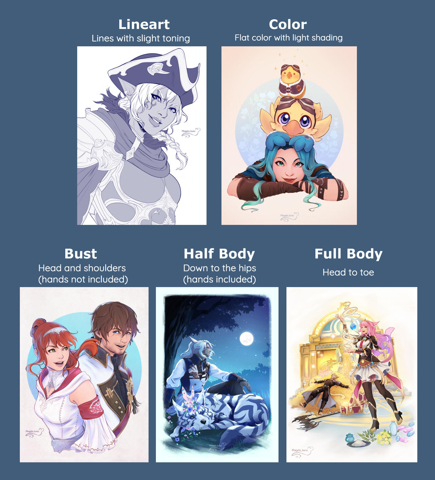 ADDITIONAL COSTS:Background / Character designs / Complex designs or poses / Additional objects or companions: